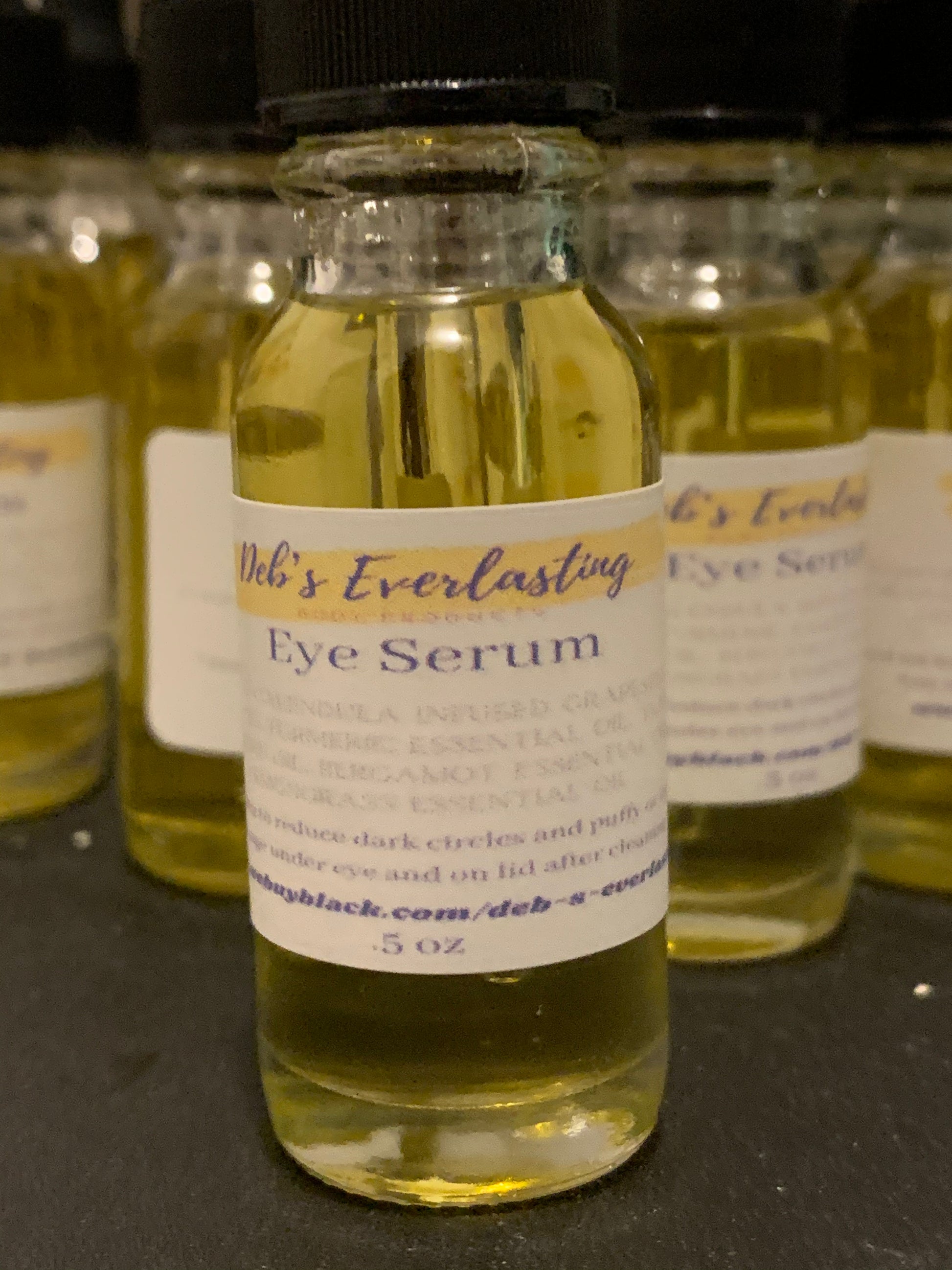 This serum is great for around the eyes to help with dry areas, puffiness & dark circles. Simply clean your face and while still a little damp lightly rub the oil on the areas needed. The Calendula infused Grapeseed oil helps with inflammation and the Turmeric & Ylang Ylang Essential Oils are great for lighting dark spots and irritation.
